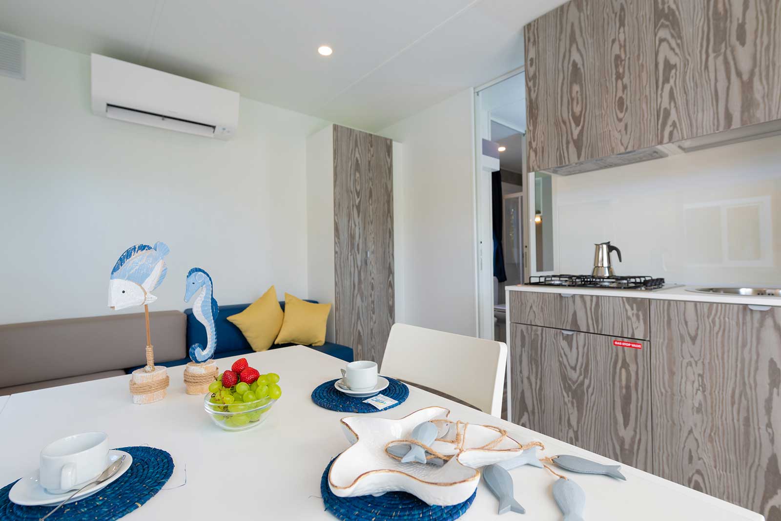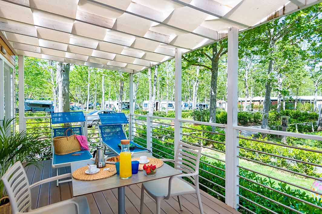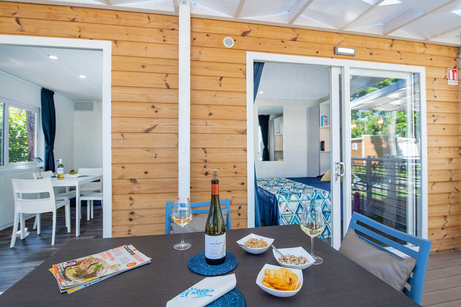 Bungalow Bilocale di 24 m2 con ingresso sulla veranda attrezzata con tavolo e sedie, giardino con lettini prendisole. Arredamento di design: open space composto da soggiorno con divano letto e sala da pranzo con angolo cucina dotato di stoviglie, TV.