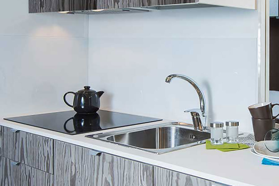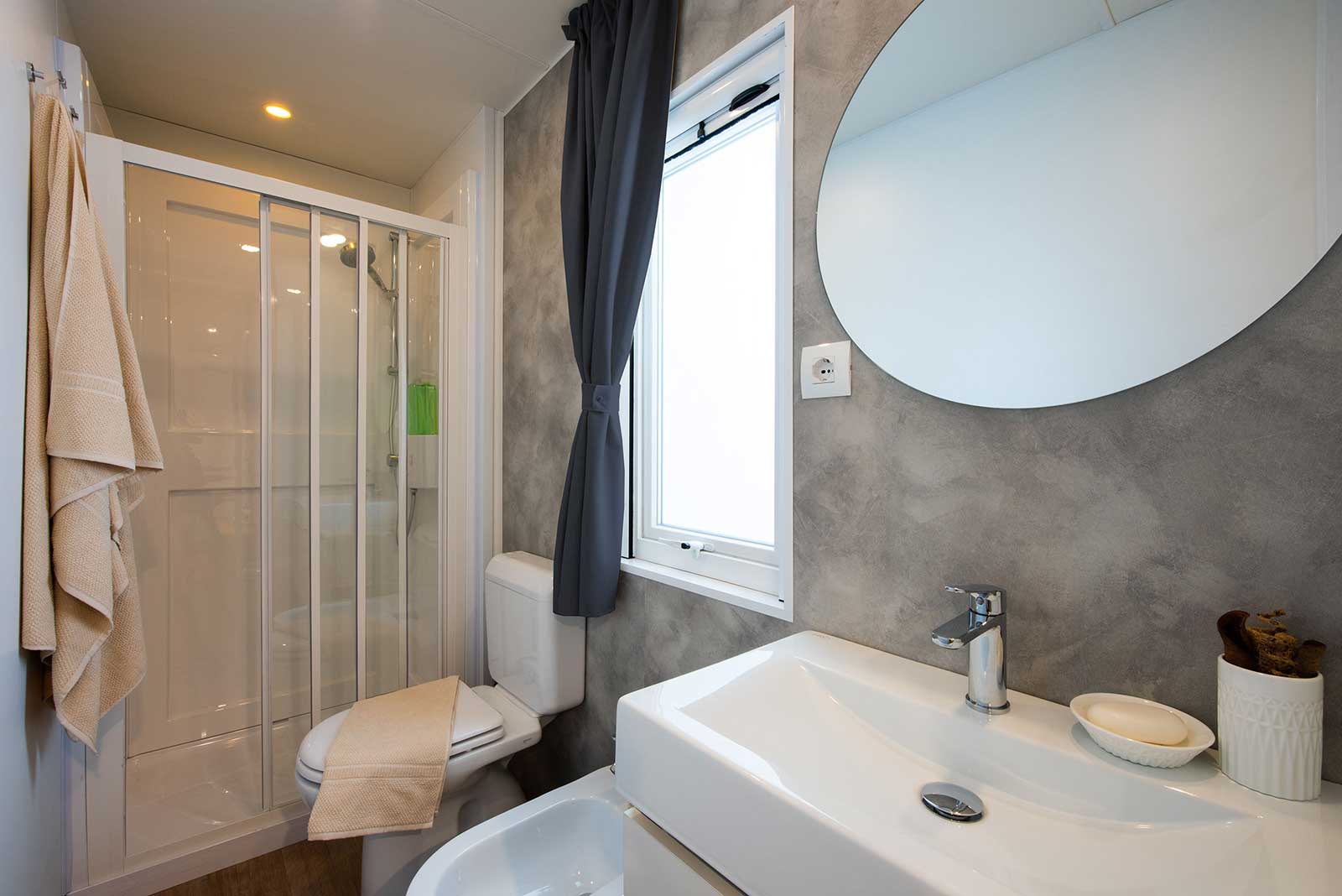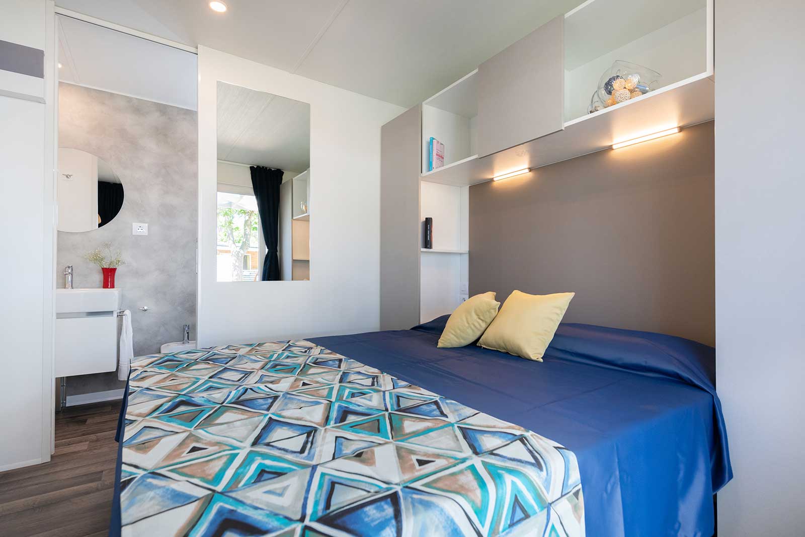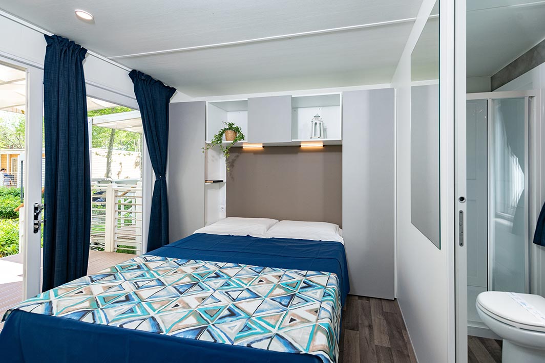 Bungalow Bilocale di 24 m2 con ingresso sulla veranda attrezzata con tavolo e sedie, giardino con lettini prendisole. Arredamento di design: open space composto da soggiorno con divano letto e sala da pranzo con angolo cucina dotato di stoviglie, TV.