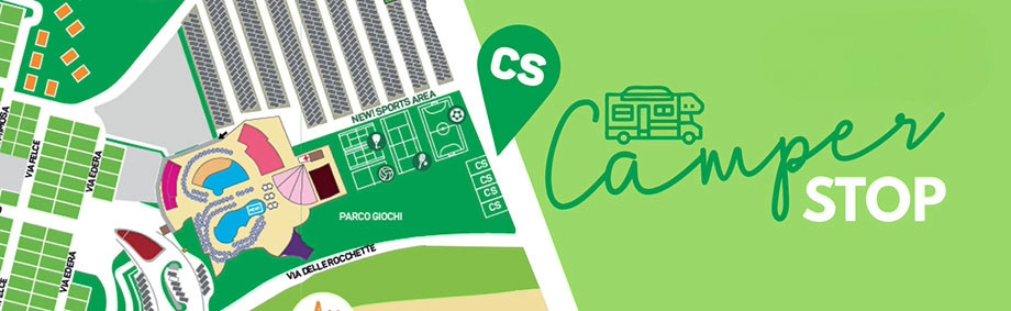 Camper Stop è un servizio ideato per offrire soste temporanee dalle 18:00 fino alle 11:00 del giorno successivo, o come area per late check-out. Questa zona è situata all'ingresso del parcheggio, vicino all'area sportiva, e consente di usufruire dei servizi interni del campeggio a tariffe particolarmente vantaggiose.