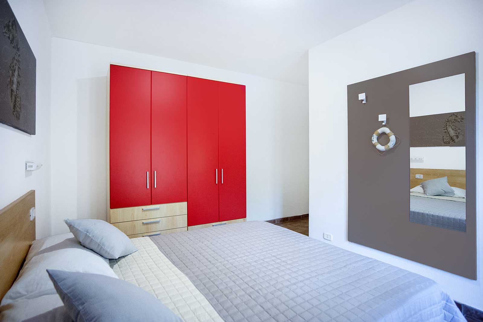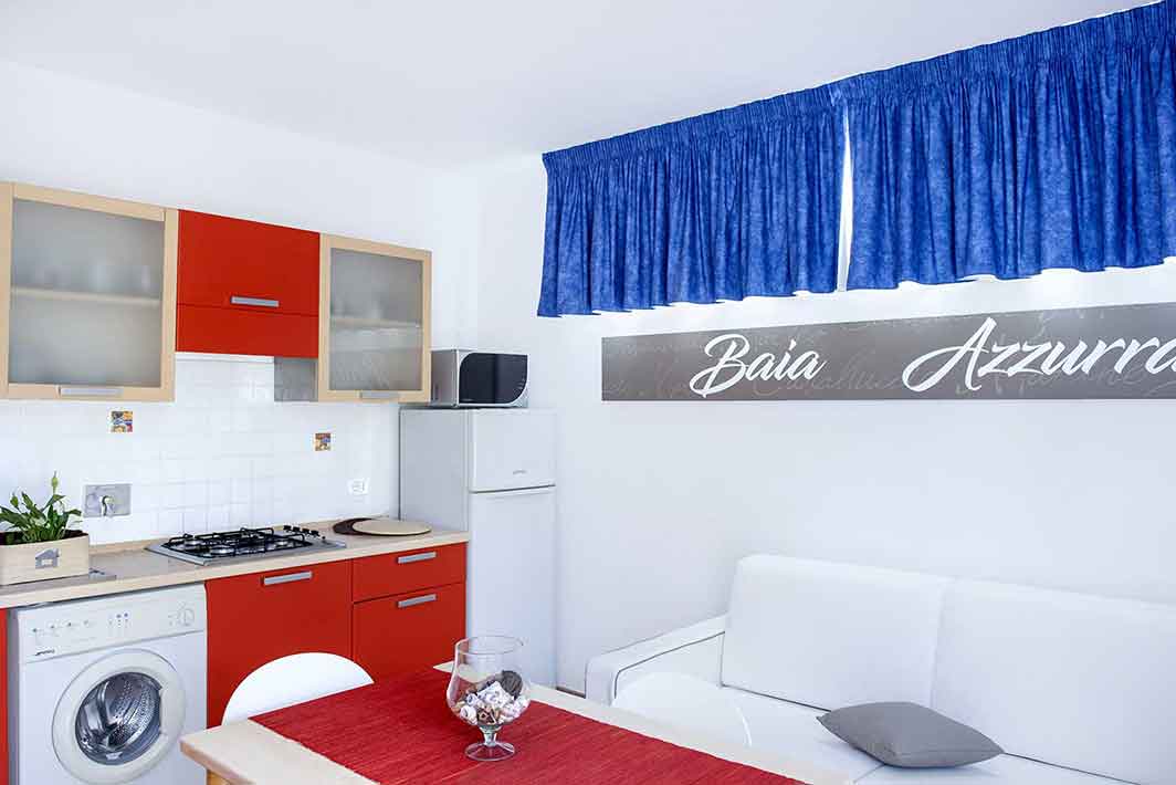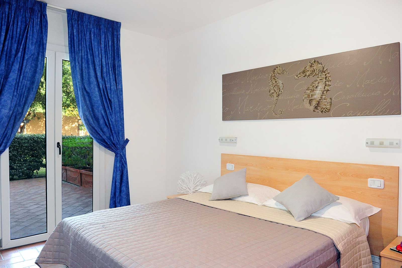 Appartamento di 38 mq al pianoterra con ingresso indipendente, giardino privato e veranda attrezzata, sedie, lettini prendisole e barbecue, 2 camere (una matrimoniale ed una doppia), bagno con doccia, bidè e phon a parete, soggiorno con divano letto matrimoniale, angolo cottura dotato di stoviglie, lavastoviglie, TV, lavatrice, forno a microonde, climatizzatore (caldo / freddo), cassaforte.